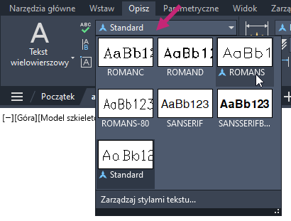 Style tekstu opisowego nie są wymagane do utworzenia tekstu opisowego, ale pomagają uprościć ten proces, podobnie jak nieopisowe style tekstu. Główną różnicą między stylami tekstu opisowego i nieopisowego jest właściwość Opisowy. Gdy właściwość Opisowy jest włączona i dany styl jest bieżący, wszelki utworzony tekst jest opisowy. Właściwość Wysokość tekstu na papierze określa końcową wysokość tekstu, natomiast właściwość Dopasuj orientację tekstu do układu określa, czy tekst jest zorientowany względem układu i rzutni, w której jest wyświetlany.