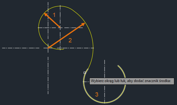 W przypadku łuku lub okręgu można użyć polecenia WYMCENTRUM, ale jego możliwości mogą być ograniczone. Można także utworzyć blok dla znaczników środka i skalować go w zależności od potrzeb, co ma również swoje ograniczenia i może być czasochłonne.