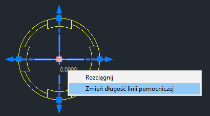 Wskazanie kursorem wielofunkcyjnego uchwytu środkowego znacznika środka spowoduje wyświetlenie menu. W tym miejscu można rozciągnąć element, aby przesunąć znacznik środka i proporcjonalnie zmienić długość wszystkich czterech przedłużeń linii środkowej.