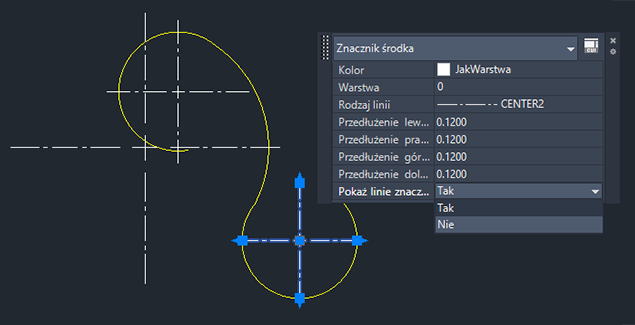 | CENTERLTYPE | Określa rodzaj linii używanych przez znaczniki środka i osie symetrii. | „CENTER2” | Rysunek |