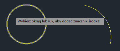 Jeśli jednak znacznik środka zostanie odsunięty od okręgu, zostanie on także odłączony. Jeśli znacznik środka nie jest połączony z obiektem, wyświetlany jest żółty identyfikator, który wskazuje, że jest on odłączony.