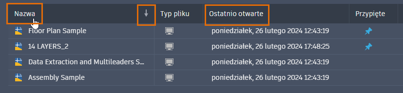 - Widok listy: kliknij nagłówek kolumny Nazwa lub Ostatnio otwarte, aby posortować dokumenty. Aby odwrócić porządek sortowania, kliknij pionową strzałkę po prawej stronie metody sortowania.