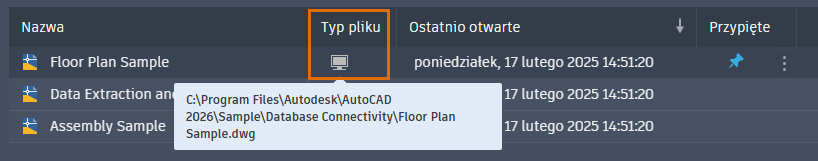 - W każdym widoku ustaw kursor na ikonie Typ pliku, aby wyświetlić ścieżkę źródłową pliku.