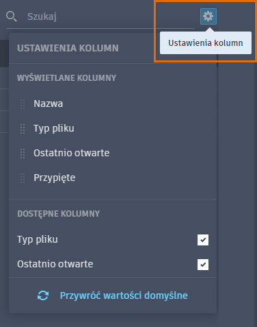 Ikona ustawień kolumny (koła zębatego) w prawym górnym rogu widoku listy umożliwia dostosowanie widoku przez przełączanie wyświetlanych kolumn i kolejności ich wyświetlania. Kolumny Nazwa i Przypięte są zawsze wyświetlane jako odpowiednio pierwsza i ostatnia kolumna.