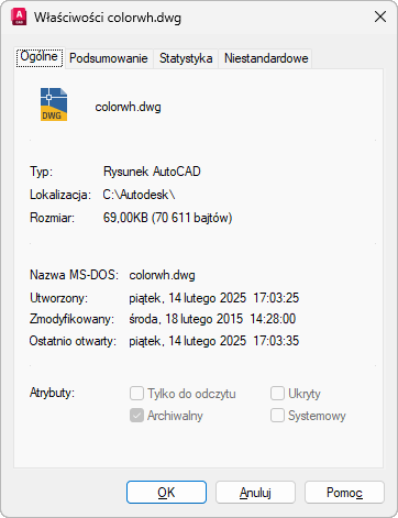 Wyświetla informacje tylko do odczytu dotyczące pliku rysunku, które są pobierane z systemu operacyjnego.