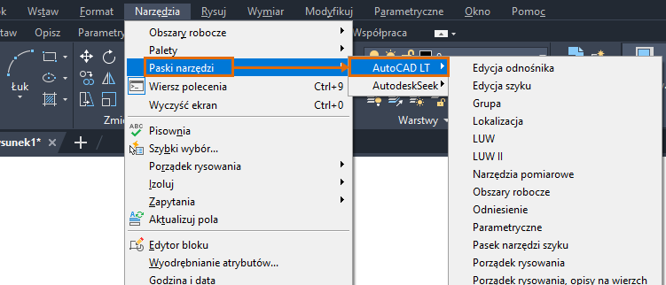 Uwaga: Upewnij się, że masz otwarty rysunek, aby było uwzględnione menu Narzędzia.