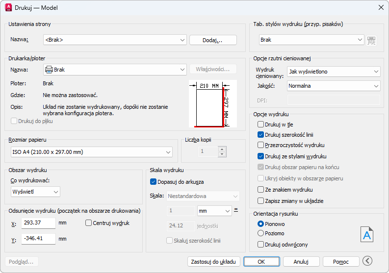 Domyślny rozmiar strony jest ustawiany dla urządzenia drukującego podczas tworzenia pliku PC3 za pomocą kreatora Dodaj ploter. Rozmiar papieru wybrany w oknie dialogowym Ustawienie strony zostanie zapisany z układem i nadpisze ustawienia w pliku PC3.