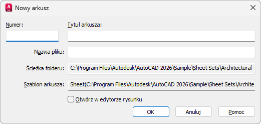 Określa numer arkusza. Zaleca się, aby podczas tworzenia pierwszego arkusza nie wpisywać numeru arkusza. Domyślnie nazwa rysunku i nazwa układu nowego arkusza będą numerem arkusza wraz z tytułem arkusza.