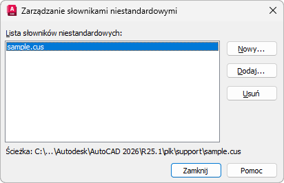 Okno dialogowe Zarządzanie słownikami niestandardowymi