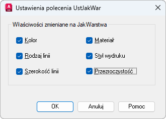 Zmienia nadpisania właściwości koloru, rodzaju linii, szerokości linii, materiału, stylu wydruku i przezroczystości dla wybranych obiektów i wstawionych bloków na odblokowanych warstwach na JakWarstwa.