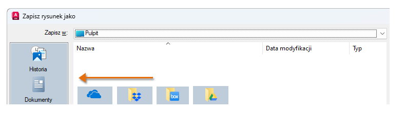 Wygodną metodą uzyskiwania dostępu do rysunków na koncie w chmurze jest dodawanie dostawcy przechowywania w chmurze na pasku Miejsca. W niektórych przypadkach jest to wykonywane automatycznie. Jeśli nie, kliknij prawym przyciskiem myszy pasek Miejsca, aby dodać preferowanego dostawcę usług przechowywania w chmurze.