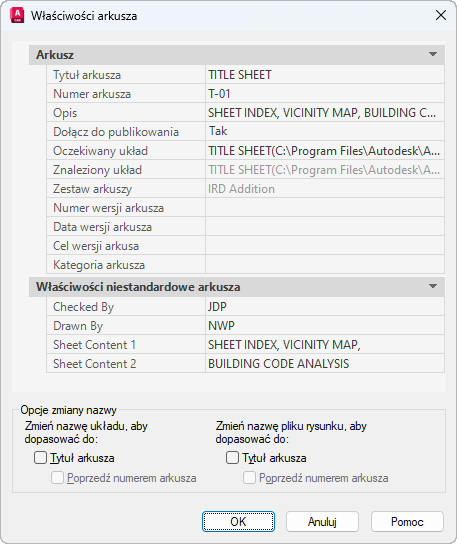 Wyświetla informacje charakterystyczne dla wybranego arkusza, takie jak tytuł arkusza, numer arkusza i określa, czy arkusz ten zostanie objęty operacjami publikowania. Wyświetla również właściwości niestandardowe, jeśli istnieją.