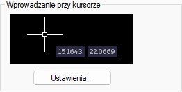 Opcja wprowadzania dynamicznego zawiera trzy komponenty: wprowadzanie przy kursorze (wskaźniku), wprowadzanie wymiarów i monity dynamiczne. Aby sterować tym, co jest wyświetlane przez każdy komponent przy włączonej opcji wprowadzania dynamicznego, kliknij prawym przyciskiem myszy przycisk wprowadzania dynamicznego i wybierz opcję Ustawienia.