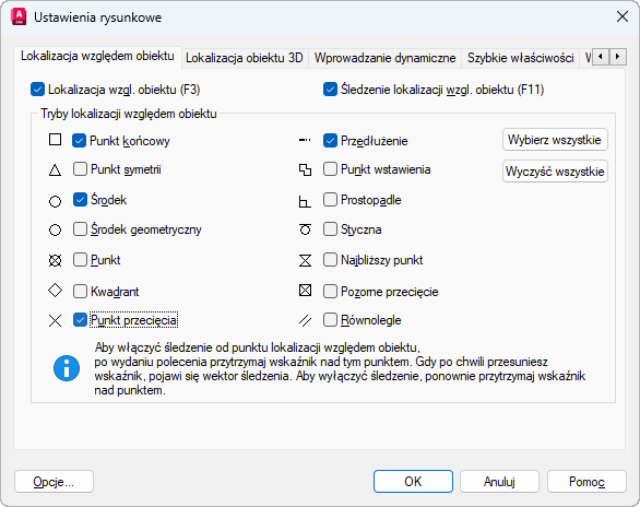 W ustawieniach trybów lokalizacji względem obiektu, nazywanych także „running osnaps”, można określić punkt w dokładnej lokalizacji w obiekcie. Naciskając klawisz TAB, można przejrzeć dostępne opcje.