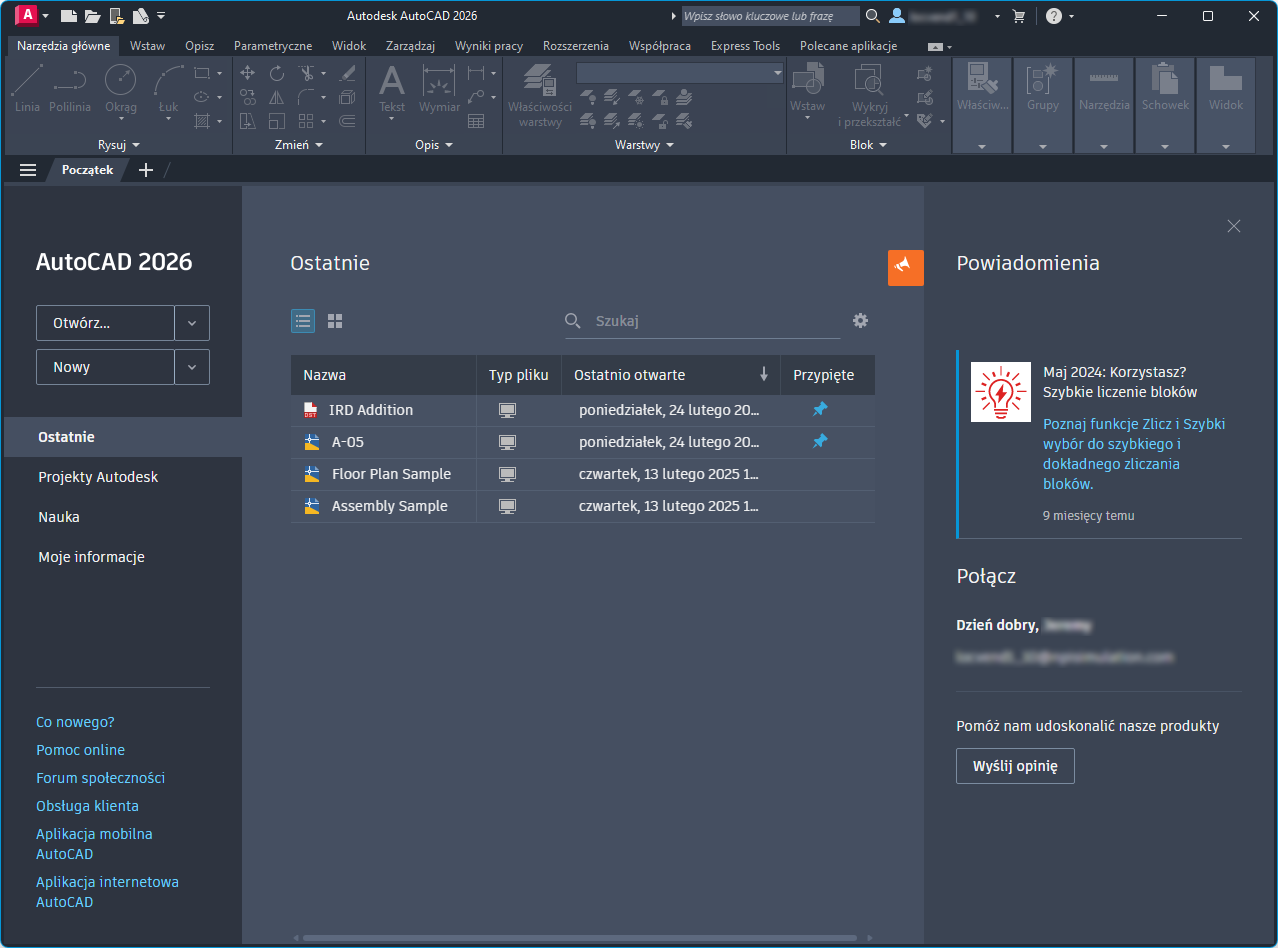 Karta Początek wyświetlana jest domyślnie po uruchomieniu programu, zapewniając łatwy dostęp do różnych początkowych operacji, w tym uzyskania dostępu do plików szablonu rysunku, ostatnio otwartych rysunków i zestawów arkuszy oraz opcji trybu online i nauki oraz powiadomień.
