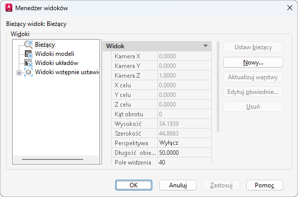 W przypadku widoków modelu i układu wyświetla bieżącą pozycję kamery.