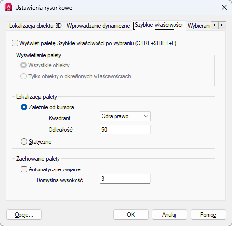 Określa ustawienia wyświetlania palety Szybkie właściwości. Aby uzyskać więcej informacji, zobacz Dostosowywanie Szybkich właściwości.