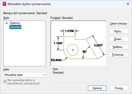 Wyświetla nazwę bieżącego stylu wymiarowania. Domyślny styl wymiarowania to STANDARD. Bieżący styl zostaje zastosowany do tworzonych wymiarów.