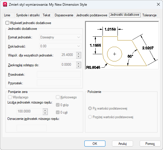 Określa wyświetlanie wymiarów w jednostkach dodatkowych oraz ustawia ich format i dokładność.