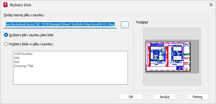 Używa wybranej definicji bloku z określonego pliku rysunku lub pliku szablonu rysunku.