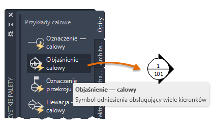 - Przeciągnij rysunki, bloki i kreskowania z programu DesignCenter. Rysunki dodane do palety narzędzi zostaną po przeciągnięciu do rysunku wstawione w postaci bloków.