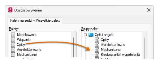 Aby uporządkować palety narzędzi i zmniejszyć liczbę palet widocznych w oknie Palety narzędzi, można zdefiniować i wyświetlać grupy palety narzędzi. Grupa palet narzędzi ogranicza liczbę palet wyświetlanych w oknie Palety narzędzi. Opcja Dostosuj palety wyświetla okno z opcjami pozwalającymi tworzyć i porządkować grupy palet narzędzi.