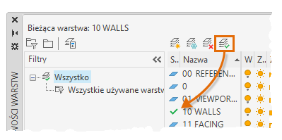 Wszystkie nowe obiekty rysowane są domyślnie na warstwie bieżącej. Zielony znacznik wyboru w Menedżerze właściwości warstw wskazuje warstwę bieżącą.