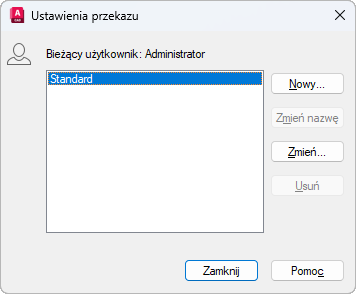 Zmienia nazwę aktualnie wyróżnionego ustawienia przekazu.