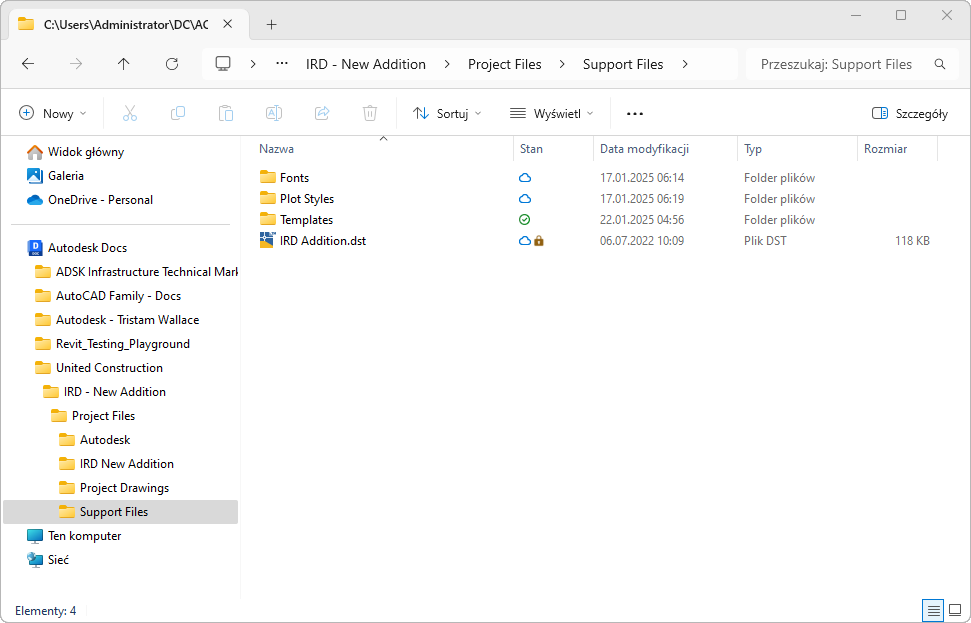 Pliki pomocnicze dodane do folderów lokalnych zostaną zsynchronizowane z usługą Autodesk Docs za pomocą programu Desktop Connector.