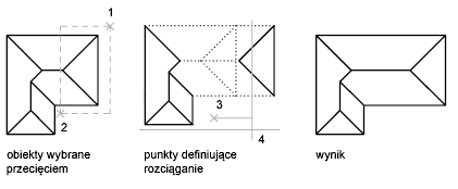 Za pomocą polecenia ROZCIĄGNIJ można zmienić położenie punktów końcowych obiektów, które leżą częściowo lub całkowicie wewnątrz okna przecinającego.