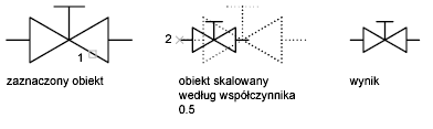 Za pomocą polecenia SKALA można sprawić, że obiekt będzie proporcjonalnie większy lub mniejszy. Aby dokonać skalowania obiektu, należy określić punkt bazowy i współczynnik skali. Można też określić długość, która będzie użyta jako współczynnik skali bazujący na bieżących jednostkach rysunku.