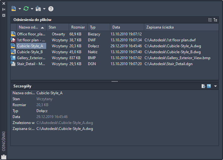 Podczas korzystania z trybu Szczegóły podawane są właściwości zaznaczonego odniesienia pliku. Każde odniesienie pliku ma podstawowy zestaw właściwości, a dla niektórych odniesień pliku, jak np. obrazy z odnośnika, są wyświetlane właściwości specyficzne dla danego typu pliku. Podstawowy zestaw właściwości zawiera takie informacje jak: nazwa odnośnika, stan, rozmiar pliku, typ pliku, data utworzenia, zapisana ścieżka, ścieżka odnalezionego pliku oraz wersja pliku, jeśli jest zainstalowany klient programu Autodesk Vault (niedostępny w programie AutoCAD LT). Niektóre właściwości można edytować.