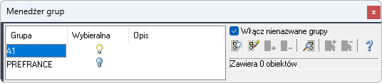 Jeśli grupa nie jest wybieralna, ikona żarówki nie będzie dostępna, zaś wybranie jednego elementu grupy nie spowoduje wybrania żadnego innego. Jeżeli zmienna systemowa PICKSTYLE ustawiona jest na 0, żadna grupa nie jest wybieralna.