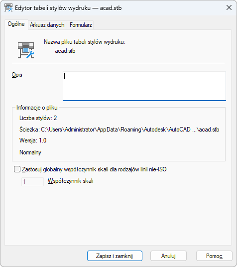 Wyświetla informacje o edytowanej tabeli stylów wydruku: liczbę stylów wydruku, ścieżkę dostępu oraz numer wersji Edytora tabeli stylów wydruku.