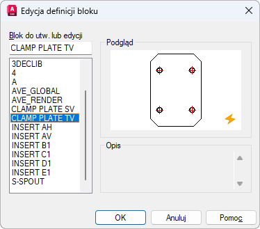 Wyświetla podgląd wybranej definicji bloku. Ikona błyskawicy wskazuje, że jest to definicja bloku dynamicznego.