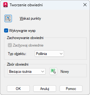 Steruje typem nowych obiektów obwiedni. OBWIEDNIA tworzy obwiednie jako regiony lub polilinie.