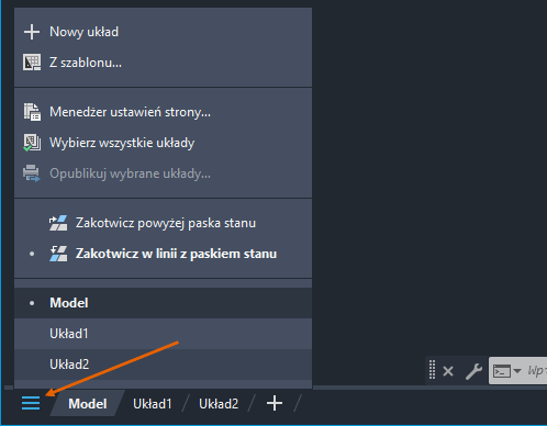 - Aby zoptymalizować przestrzeń w obszarze rysunku, kliknij prawym przyciskiem myszy kartę Model lub kartę układu i wybierz opcję Zakotwicz w pasku stanu. Karty Model i Układ będą wyświetlane na pasku stanu.