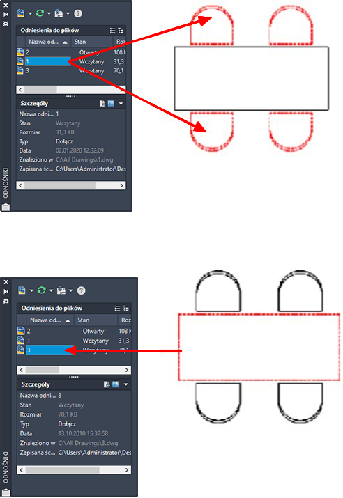 Dołączone odnośniki zewnętrzne to łącza do obszaru modelu określonego pliku rysunku. Zmiany wprowadzone do rysunku odnośnika są automatycznie uwzględniane w bieżącym rysunku po jego otwarciu lub ponownym wczytaniu odnośnika. Dołączane odnośniki nie powiększają znacznie rozmiaru bieżącego rysunku.
