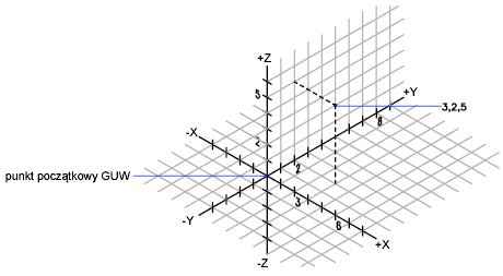 Na poniższej ilustracji współrzędne 3, 2, 5 określają punkt położony w odległości 3 jednostek wzdłuż dodatniej osi X, 2 jednostek wzdłuż dodatniej osi Y i 5 jednostek wzdłuż dodatniej osi Z.