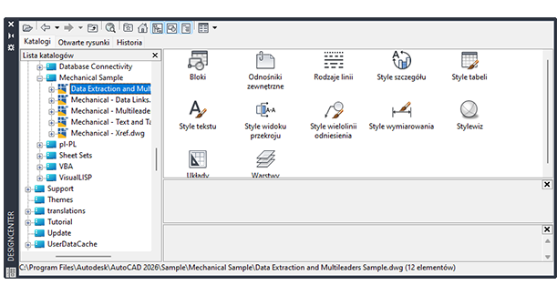 Widok drzewa po lewej stronie umożliwia przeglądanie źródeł zawartości i wyświetlanie jej w obszarze zasobów z prawej strony. Z obszaru zasobów można dodawać elementy do rysunku lub palety narzędzi. Dla wybranych rysunków, bloków, wzorów kreskowania lub odnośników zewnętrznych jest wyświetlany podgląd lub opis.