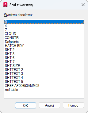 To okno dialogowe określa warstwę, z którą wybrane warstwy są scalane. Scalane warstwy dziedziczą właściwości warstwy wybranej w tym oknie dialogowym.