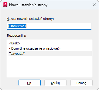 Ustala ustawienie strony, które zostanie użyte jako cecha początkowa dla nowych ustawień strony. Po kliknięciu przycisku OK wyświetlane jest okno dialogowe Ustawienia strony z ustawieniami wybranego ustawienia strony, które, jeśli trzeba, można zmodyfikować.