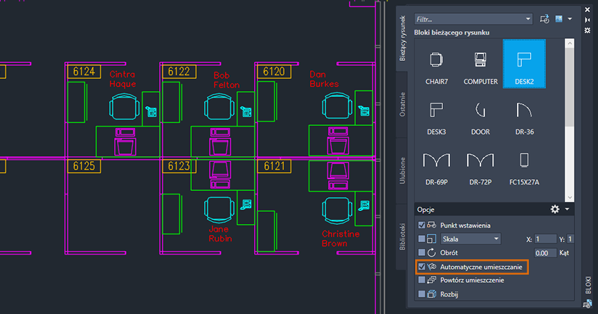 Funkcja automatycznego umieszczania bloków umożliwia łatwe wstawianie bloków za pomocą palety Bloki, udostępniając sugestie oparte na podobnej geometrii i wzory uzyskane na podstawie poprzednich wystąpień bloków na rysunku.