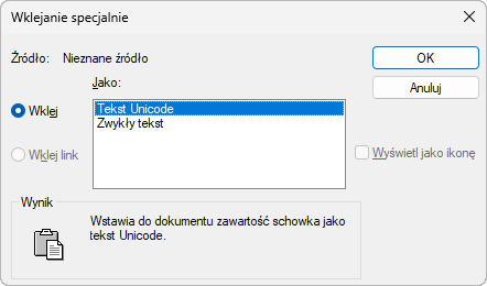 Wyświetla dostępne formaty, w których można wkleić zawartość Schowka do bieżącego rysunku.