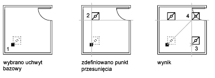 Można także utworzyć wiele kopii, przytrzymując naciśnięty klawisz Ctrl w czasie wybierania pierwszego punktu. Przykładowo, korzystając z uchwytów w trybie rozciągania, można rozciągnąć obiekt taki jak linia, a następnie skopiować go w dowolne miejsce obszaru rysunku. Będzie tworzonych wiele kopii, dopóki nie zostaną wyłączone uchwyty.