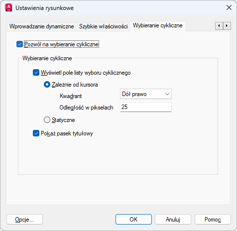 Dzięki funkcji wybierania cyklicznego można wybierać obiekty, które się nakładają, naciskając klawisze Shift + spacja. Można określić, czy niebieska ikona kursora jest wyświetlana w celu wskazania obiektów nakładających się i skonfigurować ustawienia wyświetlania pola listy Wybór.