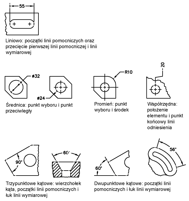 Punkty definiujące dla każdego typu wymiaru są oznaczone na następujących ilustracjach. Punkt środkowy tekstu wymiarowego jest punktem definiującym dla wszystkich typów wymiarów.