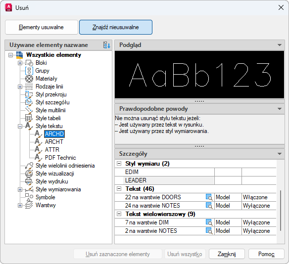 Większość tych obiektów jest w danej chwili używana na rysunku lub jest domyślnymi elementami, których nie można usunąć. Po zaznaczeniu poszczególnych nazwanych obiektów wyświetlane są informacje, dlaczego danego elementu nie można usunąć.