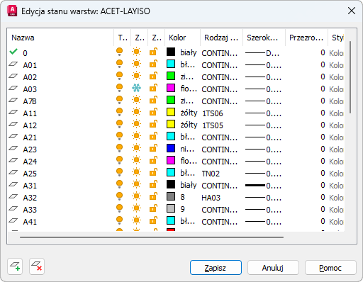 Wyświetla wszystkie warstwy i ich właściwości, które zostały zapisane w wybranym stanie warstw.
