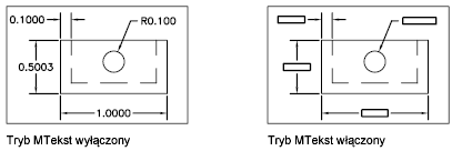 Jeśli włączono tryb Mtekst (markowania tekstu), wyświetlana lub drukowana jest tylko prostokątna ramka, która identyfikuje obszar tekstu.